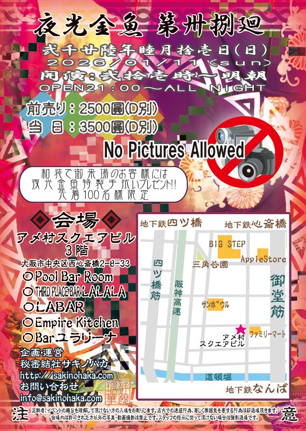 和装で御来場頂いたお客様には、秘密結社サキノハカ謹製夜光金魚手ぬぐいを、先着100名様にプレゼント!!